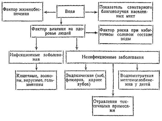 В основе гигиенических требований к качеству питьевой воды лежат те качества воды, от которых зависят здоровье человека и условия его жизни. Влияние некачественной воды на здоровье может быть непосредственным в виде инфекционных заболеваний или заболеваний неинфекционной природы и интоксикаций, и косвенным в виде неприятных органолептических ощущений, что заставляет человека отказываться от употребления такой воды (рис.1).
