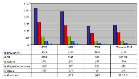 Начавшийся ипотечный кризис 2007 года внес свои коррективы в объем рынка рекламы уже в 2008 г., когда одни из крупнейших рекламодателей – местные банки второго уровня и строительные компании – существенно сократили свои расходы на рекламу (рисунок 1).