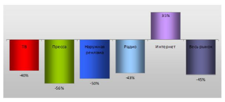 На рисунке 2 представлена структура изменения рекламных бюджетов компаний по сегментам рекламы в процентном отношении 2009 года к 2008 году.