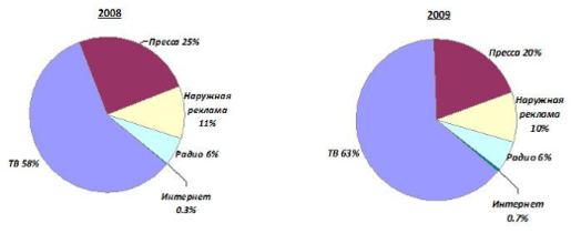 Таким образом, как видно из рисунка 3, доля телевидения в общем рекламном бюджете компаний в 2009 году по отношению к 2008 году выросла с 58% до 63%, в количественном выражении телерекламы потеряла примерно 40%, а ее объем составил 85,1$ млн. без НДС.