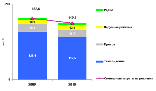 По данным TNS Central Asia, суммарный объем затрат на рекламу (по всем медианосителям) в 2010 году, согласно официальным прайс-листам, сократился на 8,1% в сравнении с 2009 годом. Суммарный рекламный бюджет в 1 квартале 2010 года составляет 149,4 млн. USD, по сравнению с 2009 годом - 162,6 млн. USD [57, с.4].
