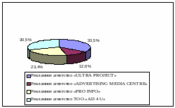 Как видно из рисунка 6, лидером рынка на конкурентном рынке рекламных услуг является рекламное агентство «ULTRA PROJECT», доля которого 33,5%, доля рекламного агентства «ADVERTISING MEDIA CENTRE» - 12,6%, рекламного агентства «PRO INFO» - 23,4%, рекламного агентства ТОО «AD 4 U» - 30,5%.