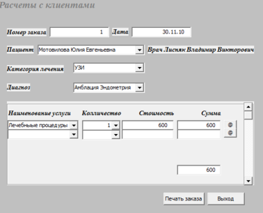 Оплата лечения проводится администратором-кассиром на основании данных, полученных в результате заполнения врачом амбулаторной карты пациента. Таким образом, отпадает необходимость дублирования записей, администратору просто нужно ввести внесенную пациентом сумму и программа автоматически зарегистрирует платеж в базе данных.