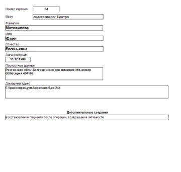 Данные из карты пациента могут быть представлены в произвольно задаваемом виде с помощью мощного и настраиваемого механизма выписок. Создание выписок происходит автоматически и освобождает пользователей от длительной работы по сбору информации: несколько секунд, и вы получаете готовую выписку в виде документа Microsoft Word.