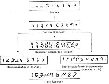 Создание десятичной позиционной системы счисления, одного из выдающихся достижений средневековой науки, - заслуга индийских математиков. Позиционные десятичные записи чисел встречаются в Индии с VI в. Так, в дарственной записи 595 года встречается запись числа 346 цифрами брахми