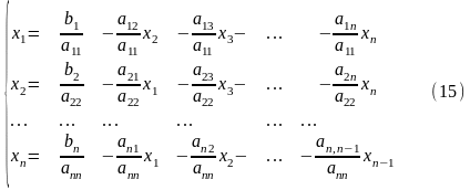 Предполагая, что диагональные элементы aii 0 (i = 2, ..., n), выразим xi через первое уравнение систем x2 - через второе уравнение и т. д. В результате получим систему, эквивалентную системе (14):