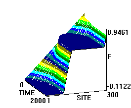 Как видим, системы (2) и (4) существенно различаются. Отметим, однако, что проведенное нами численное моделирование динамики систем (2) и (4) показало следующее: если в качестве начальных условий для численного интегрирования (2) выбрать односолитонное решение его “непрерывного аналога” (3) - кинк (см. выше), то обнаруживается принципиальное сходство в характере решений.