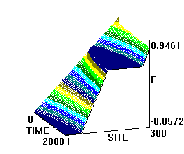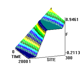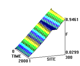Существует также и другая сложность в отношении самосогласования биосолитонов и волны электромагнитного переизлучения. Напомним, что математическое моделирование в данном случае проводилось на монотонной поли-A ДНК и поэтому оставалось неясным влияет ли гетерогенная естественная последовательность ДНК на динамику солитонного возбуждения в молекуле. Чтобы проверить это, как и ранее, был взят С-район ДНК на 3’-конце вируса саркомы птиц в качестве полигона для запуска солитонов на разных участках полимера. На этот раз вычисляли производную от функции с тем, чтобы нагляднее показать движения солитонов.