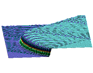 Солитонное возбуждение ДНК, но с учётом нелинейности ковалентных связей в сахаро-фосфатном остове ДНК. Последовательность нуклеотидов - вирус саркомы птиц (первые 600 пар оснований). Центр возмущения - 200-ый нуклеотид.