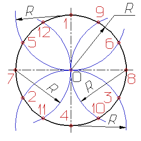 Деление окружности на три, шесть и двенадцать равных частей выполняется в следующей последовательности (рис.9):
