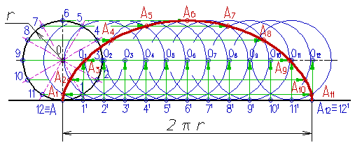 На направляющей горизонтальной прямой откладывают отрезок АА12, равный длине производящей окружности радиуса r, (2pr); Строят производящую окружность радиуса r, так чтобы направляющая прямая была касательной к неё в точке А; Окружность и отрезок АА12 делят на несколько равных частей, например на 12; Из точек делений 11, 21, ...121 восстанавливают перпендикуляры до пересечения с продолжением горизонтальной оси окружности в точках 01, 02, ...012; Из точек деления окружности 1, 2, ...12 проводят горизонтальные прямые, на которых делают засечки дугами окружности радиуса r; Полученные точки А1, А2, ...А12 принадлежат циклоиде.
