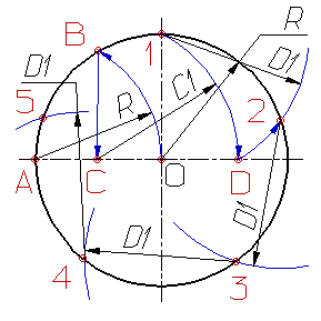Точки 3, 4 и 5 находят откладывая циркулем по данной окружности хорды, равные D1.