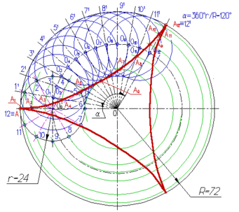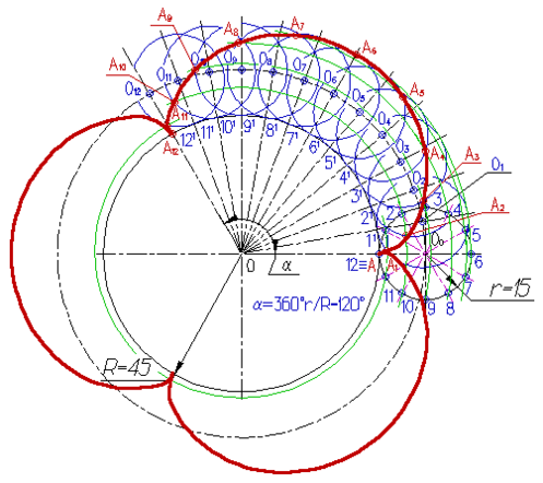 Из центра 0 проводят вспомогательные дуги через точки деления 1, 2, ... 12 производящей окружности; Из точек 01, 02, ...012, как из центров, проводят окружности радиуса r до пересечения с вспомогательными дугами в точках А1, А2, ... А12, которые принадлежат эпициклоиде.