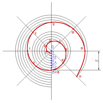 Спираль Архимеда (рис.15) - плоская кривая, которую описывает точка, движущаяся равномерно-поступательно от центра 0 по равномерно-вращающемуся радиусу.