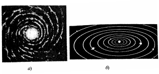 Современная картина мироздания, имеющая строгое научное обоснование, существенно отличается от прежних моделей. Она исключает существование какого-либо «центра мира» (равно как и магическую роль платоновых тел) и рассматривает Вселенную с позиций единства симметрии и асимметрии. Наблюдая хаотическую россыпь звезд на ночном небе, мы понимаем, что за внешним хаосом скрываются вполне симметричные спиральные структуры галактик, а в них — симметричные структуры планетных систем. Эту симметрию неплохо иллюстрирует рисунок, на котором изображены наша Галактика (рис. 16, а) и (с большим увеличением по сравнению с Галактикой и несколько упрощенно) Солнечная система (рис. 16, 6).