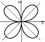 Ее сейчас называют декартовым листом. Любопытно, что хотя Декарт применял уже в своей алгебре не только отрицательные, но даже мнимые числа, он не рассматривал отрицательных значений координат. Первоначально декартов лист считали симметричным относительно осей координат (рис. 21).