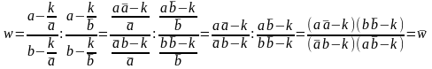 Пусть координаты пересечения второй окружности с действительной осью равны а1 и а2, у первой окружности это будут точки с координатами -1 и 1. Пусть на оси дана точка О с координатой s. Тогда при инверсии с центром в точке О и степенью k будут выполняться равенства: