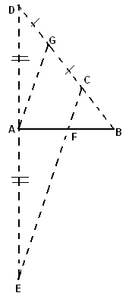 Возьмем какую-либо точку С, не лежащую на прямой АВ. Продолжим прямую ВС за точку С и отложим на ней точку D на расстоянии 2ВС от точки С (рис. 2). Продолжим прямую AD за точку А и отложим на ней точку Е на расстоянии AD от точки А. Искомая середина F отрезка АВ лежит на его пересечении с прямой ЕС. Действительно, отрезок СЕ параллелен отрезку AG — средней линии треугольника CDE (здесь G — середина отрезка CD). Так как, кроме того, BC=CG, то CF — средняя линия треугольника ABG, откуда AF=FB.