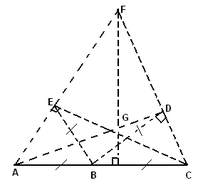 рямая FG перпендикулярна прямой АВ. Действительно, точки А, Е, D и С равноудалены от точки В, т.е. лежат на одной окружности с центром В и диаметром АС. Следовательно, вписанные углы ADC и АЕС прямые, поэтому AD и СЕ — высоты треугольника AFC. Так как все три высоты этого треугольника пересекаются в одной точке G, то прямая FG перпендикулярна стороне АС. Для того чтобы проложить перпендикуляр к прямой АВ через данную точку Н, достаточно проложить через эту точку прямую, параллельную прямой FG.
