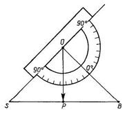 Угол наклона прямой – это угол, который она образует с горизонтальной прямой. Нить с грузиком – отвес – занимает положение прямой, перпендикулярной горизонтальной прямой. Опустим из точки О перпендикуляр к прямой SB. Получится точка Р. Восстановив из точки О перпендикуляр к прямой SO, получим угол РОВ, величину которого показывает шкала прибора.
