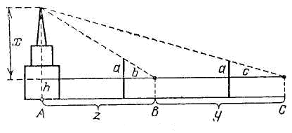 верхушка шпиля зрительно совмещается с верхним концом шеста (рис. 26). Затем, пройдя некоторое расстояние в направлении от здания по прямой, на которой лежит первая точка и проекция А шпиля на горизонтальную плоскость, еще раз проделайте такую же операцию. Пусть высота шеста над уровнем глаз равна а, расстояние от глаз до шеста в первом положении оказалось равным b , а во втором с. Тогда, измерив расстояние у между точками В и С, в которых мы стояли в первом и во втором случаях, можно сосчитать высоту х шпиля над уровнем глаз. В самом деле, обозначим через z расстояние между точками А и В. Из подобия соответствующих треугольников имеем