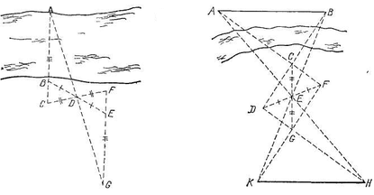 Слегка отклонив камыш и держа его в натянутом состоянии, замерим расстояние а между точками А и В, в которых камыш пересекает поверхность воды соответственно в вертикальном и наклоненном положении (рис. 23). Возвратим камыш в исходное состояние и определим высоту b над водой, на которую поднимется при этом точка В наклоненного камыша, заняв исходное положение С. Тогда, обозначив через D основание камыша, а через х — искомую глубину AD, из прямоугольного треугольника ABD находим