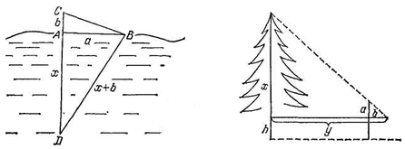 Установив вертикальный шест на некотором расстоянии от дерева, нужно стать в такую точку, из которой верхний конец шеста загораживает в точности верхушку дерева (рис. 24). Тогда, если высота части шеста над уровнем глаз равна а, а расстояния от глаз по горизонтали до шеста и до дерева равны b и у соответственно, то из подобия треугольников можно найти высоту х дерева над уровнем глаз. Наконец, зная свой рост h до уровня глаз, получаем полную высоту дерева