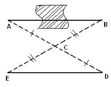 Пусть А и В — данные точки на местности, между которыми определяется расстояние. Выберем точку С, из которой видны обе точки А и В (рис. 22). На продолжении отрезка АС за точку С отметим точку D на расстоянии АС от точки С. Аналогично на продолжении отрезка ВС за точку С отметим точку Е, для которой СЕ=ВС. Тогда отрезки ED и АВ равны, поскольку они симметричны относительно точки С.