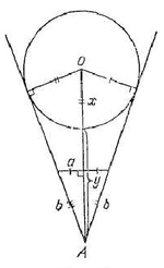 Встав в точку А на некотором расстоянии от пруда (рис. 25), можно расположить перед собой горизонтальную палку длины а так, чтобы расстояния от обоих ее концов до одного глаза (второй глаз при этом лучше закрыть) были равны одному и тому же значению b , а сами концы палки зрительно совместились с крайними точками пруда, видимыми из точки А. Тогда, измерив расстояние у от А до ближайшей точки пруда по прямой, проходящей через середину палки, можно вычислить радиус х пруда, а значит, и его диаметр 2х. Действительно, из подобия соответствующих прямоугольных треугольников находим