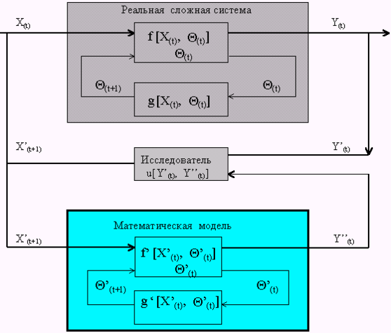Здесь X(t) - множество значений входных факторов в момент времени t, О(t) - множество значений параметров, характеризующих различные внутренние состояния сложной системы в этот же момент времени, Y(t) и Y(t-1) - множества значений измеряемых показателей изучаемых свойств системы в обозначенные моменты времени. Первые два уравнения моделируют суть изучаемого процесса, а третье уравнение является математическим описанием (моделью) процесса воздействий исследователя на изучаемую систему. Исследователю, как правило, доступно только определенное подмножество Y’(t) наблюдаемых параметров и весьма ограниченное подмножество X’(t) управляемых факторов. Его представление о внутренних состояниях исследуемой системы также ограничено некоторым подмножеством. Поэтому в представлении исследователя математическая модель исследуемой им системы имеет вид:
