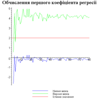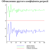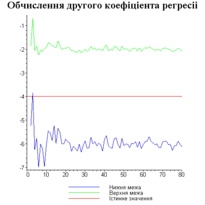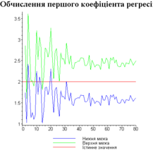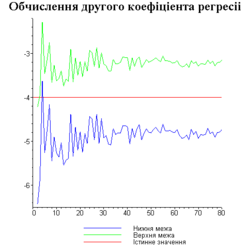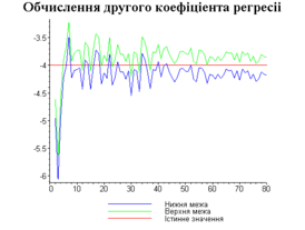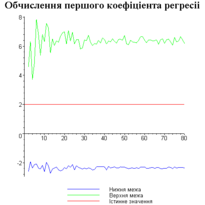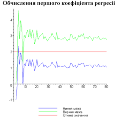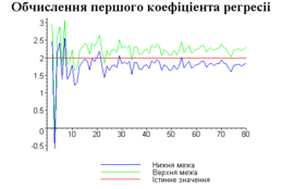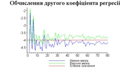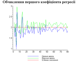 Програма повертає значення верхньої та нижньої меж інтервалів, які накривають коефіцієнти регресії. В результаті роботи цієї процедури ми отримали результати, обчислені у вигляді зручному для побудови графіка за цими даними.