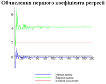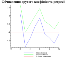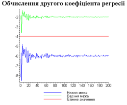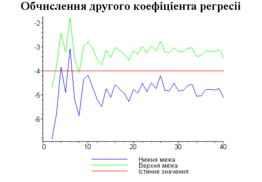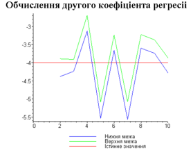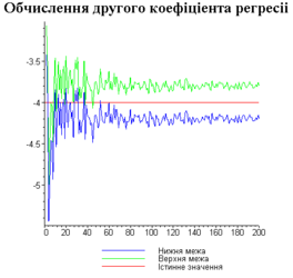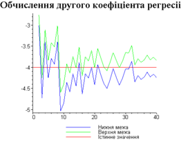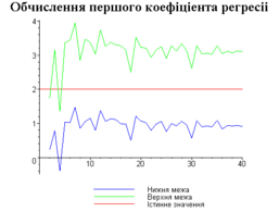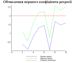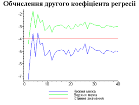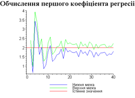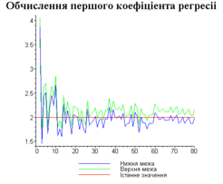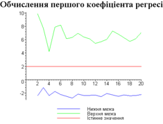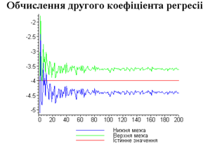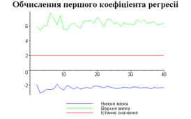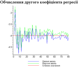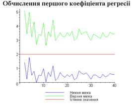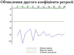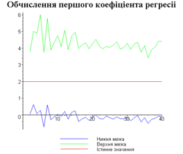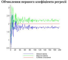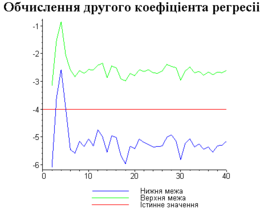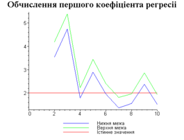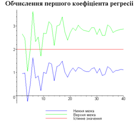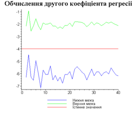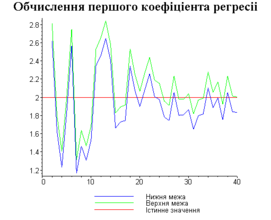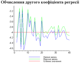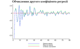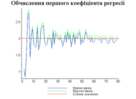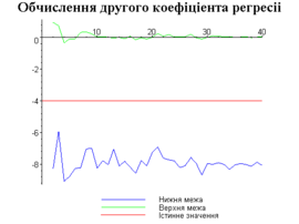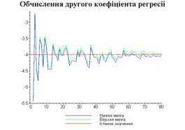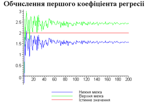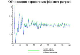 З одержаних результатів випливає, що починаючи з деякого об’єму вибірки спостерігається стабілізація, тобто різниця між верхньою та нижньою границею інтервалів, що накривають параметри регресії, перестає зменшуватись. Тому використовувати вибірки об’ємом більше, ніж це порогове значення є недоцільним, бо це не дає поліпшення результатів. Цей поріг, де починається стабілізація, не залежить від вектора похибки і приблизно дорівнює 50.