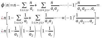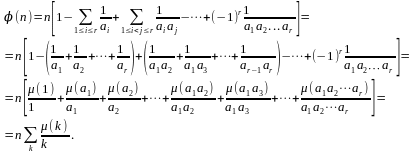 , i=1, 2, …,r, попарно взаимно просты. Количество целых чисел k таких, что 0 < k ≤ n, ai не делит k, i=1, 2, …,r, равно