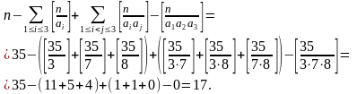 Количество целых чисел, не превосходящих 35 и не делящихся ни на 3, ни на 7, ни на 8, равно