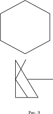 оказательство теоремы Борсука. Пусть F – фигура диаметра d. Согласно доказательной лемме, фигура F содержится внутри правильного шестиугольника, расстояние между противоположными сторонами которого равно d. Покажем, что этот правильный шестиугольник можно разрезать на три части, каждая из которых имеет диаметр, меньший d. При этом фигура F также разрежется на три части, диаметр каждой из которых будет меньше d. Требуемое разбиение правильного шестиугольника на три части показано на рис. 9 (точки P, Q и R являются серединами сторон, а О – центр шестиугольника). Чтобы убедится, что диаметры частей меньше d, достаточно заметить, что в треугольнике PQL угол Q прямой, и поэтому PQ < PL = d. Таким образом, теорема доказана.