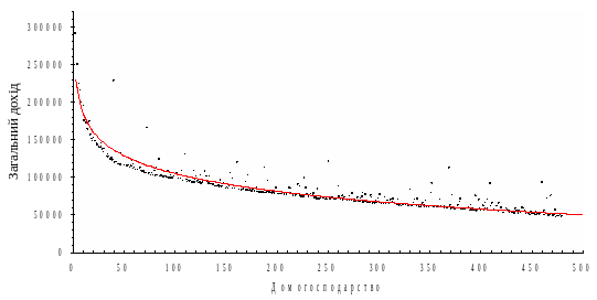 В результаті дослідження виявилось, що домогосподарства в StatVillage впорядковані за загальним доходом, а саме загальний дохід зменшується зі зростанням номеру домогосподарства. Логарифмічна регресія значуща. На рисунку 2.2.1 представлена діаграма розсіювання та логарифмічна регресія.