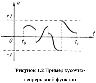 со значениями в области управления U называется кусочно-непрерывной, если она состоит из конечного числа непрерывных кусков (рисунок 1.2), т.е. непрерывна для всех рассматриваемых t, за исключением лишь конечного числа моментов времени, где функция u(t) может терпеть разрывы первого рода; последнее означает, что в каждой точке разрыва предполагается существование конечных пределов слева и справа: