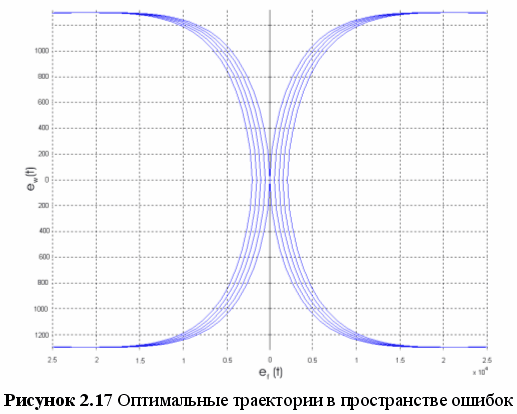 На рисунке 2.16 изображено множество оптимальных траекторий в базисе (t, t), а на рисунке 2.17 изображены те же траектории в базисе ошибок. Положение траекторий в базисе ошибок зависит от начальной ошибки по обеим фазовым координатам, то есть от угла рассогласования и разности скоростей.