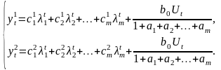 При определении моментов точек переключения можно использовать как аналитические выражения, так и численные методы. При определении моментов точек переключения аналитически необходимо решить систему уравнений вида (2.18) для частного случая, где одно из уравнений написано для кривой, являющейся главной траекторией, а другое — для кривой, проходящей через точку, в которой находится система в данный момент и пересекающую главную траекторию, описанную первым уравнением системы. Общий вид системы приведен ниже: