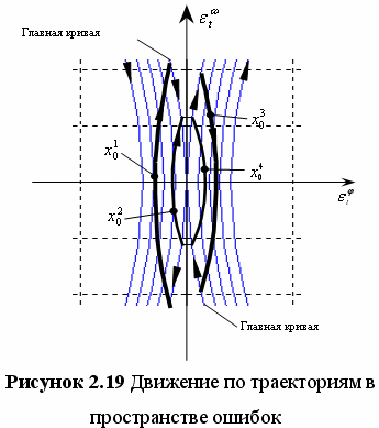 На рисунке 2.17 показаны оптимальные траектории в пространстве ошибок. Выделим из всего множества траекторий две, приводящие в ноль. Будем называть эти траектории главными. У левой главной траектории выделим верхнюю ветвь, а у правой — нижнюю. Движение по этим ветвям приводит в начало координат. Так как в разделе 1.4 была поставлена задача (1.12), то эти две ветви необходимо выделить особо, так как при движении по ним выполняется первое условие задачи (1.12).