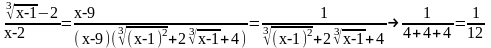 2. Здесь числитель и знаменатель стремятся к нулю, т.е. имеет место неопределенность вида 0/0. Теорема о пределе частного непосредственно неприменима. Для “раскрытия неопределенности” преобразуем данную функцию. Разделив числитель и знаменатель на x-2, получим при x 2 равенство: