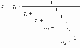 Цепная дробь может быть как конечной (содержащей конечное число дробных линий и неполных частных), так и бесконечной вниз и вправо (на юго-восток). В первом случае она, очевидно, представляет некоторое рациональное число, во втором случае - пока непонятно что она вообще из себя представляет, но ясно, что все ее подходящие дроби - рациональные числа.