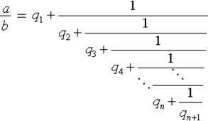 где q 1 , q 2 ,..., q n +1 - как раз те самые неполные частные из алгоритма Евклида (вот откуда название этих чисел в цепных дробях). Таким образом, в случае рационального числа a / b , процесс разложения в цепную дробь конечен и дробь содержит не более b этажей. Наиболее одаренные читатели в этом месте уже поняли, что основная теорема о цепных дробях для рациональных чисел оказалась почти доказана (не доказали только единственность разложения, но она в случае конечных цепных дробей почти очевидна - приравняйте две цепных дроби и, рассуждая по индукции, получите, что у равных дробей совпадают все неполные частные).