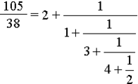 Пример. Пример заимствован из книги И. М. Виноградова "Основы теории чисел". Итак: разложить 105/38 в цепную дробь.