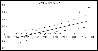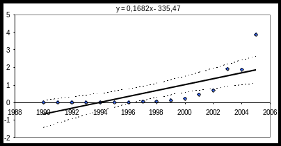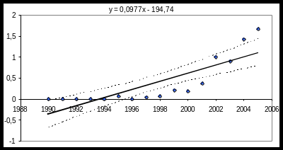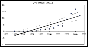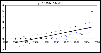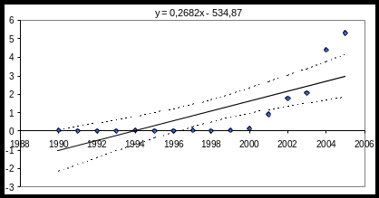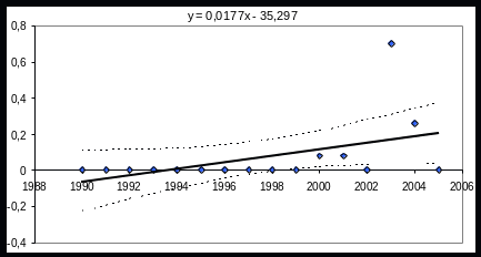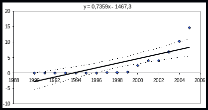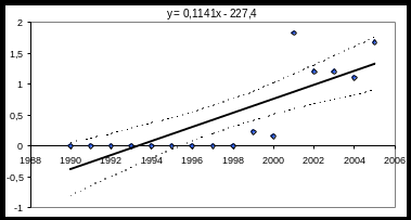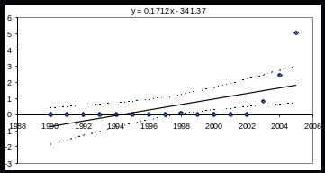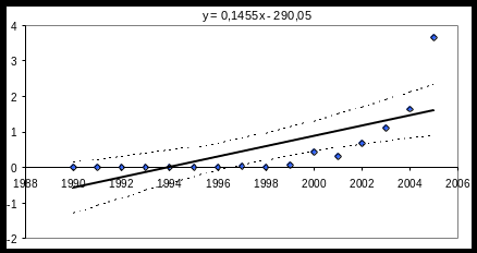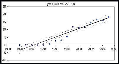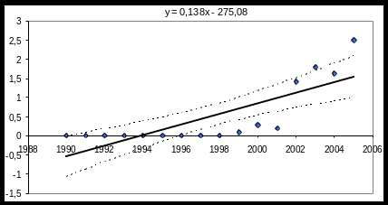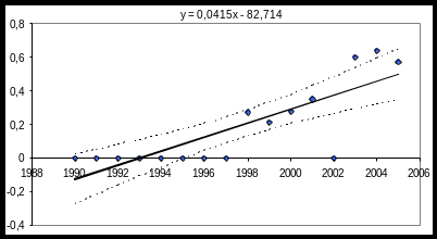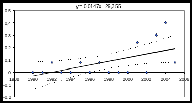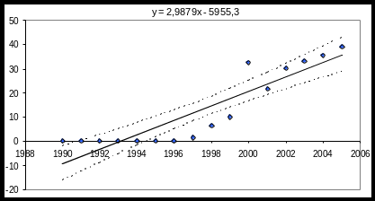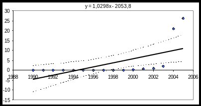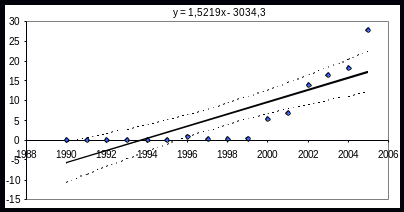 Необхідно перевірити гіпотезу про наявність лінійної залежності між y–захворюваністю на СНІД на 100 000 населення та х – роком проведення спостереження, оцінити невідомі параметри