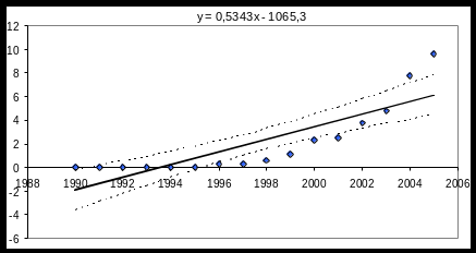 = 2,145 – гіпотеза H0:b1=0 відхиляється на рівні значущості 0,05.