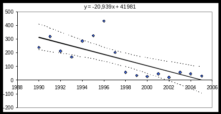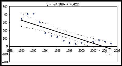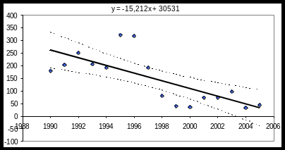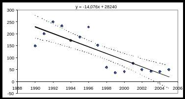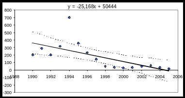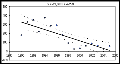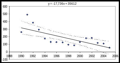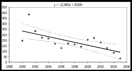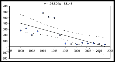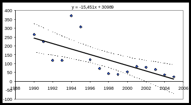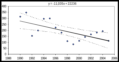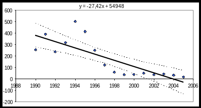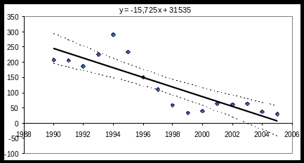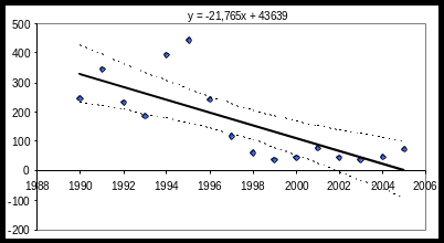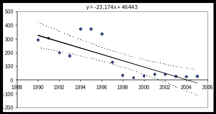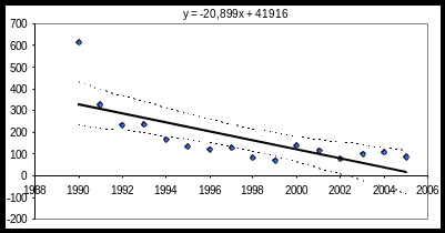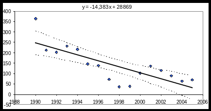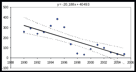 Необхідно перевірити гіпотезу про наявність лінійної залежності між y–захворюваністю на гепатит А на 100 000 населення та х – роком проведення спостереження, оцінити невідомі параметри