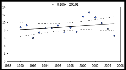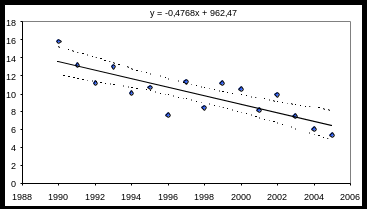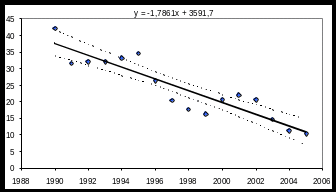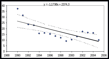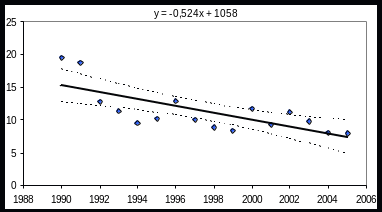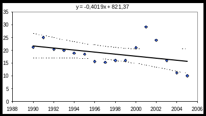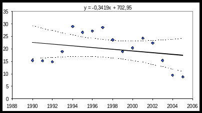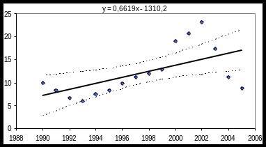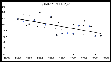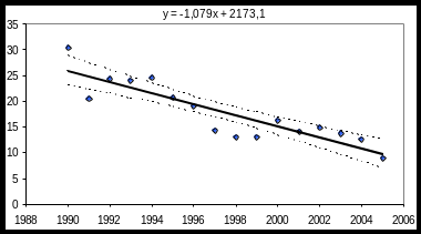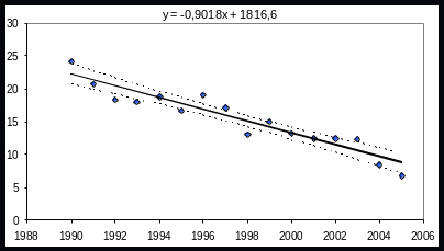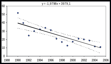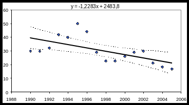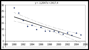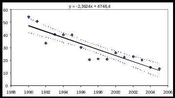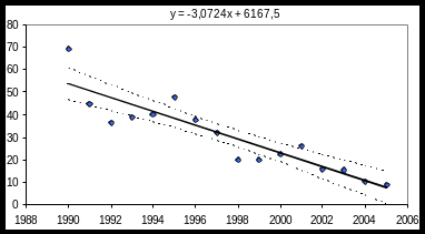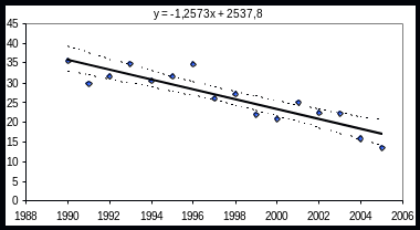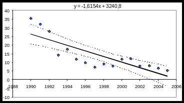 Необхідно перевірити гіпотезу про наявність лінійної залежності між y–захворюваністю на гепатит Б на 100 000 населення та х – роком проведення спостереження, оцінити невідомі параметри