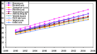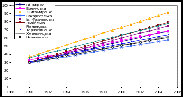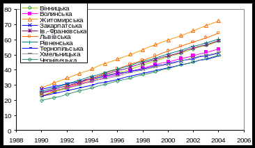 До західної України відносяться такі області: Вінницька, Волинська, Житомирська, Закарпатська, Ів.-Франківська, Львівська, Рівненська, Тернопільська, Хмельницька та Чернівецька області. Тенденції росту захворюваності в цих областях мають лінійну залежність