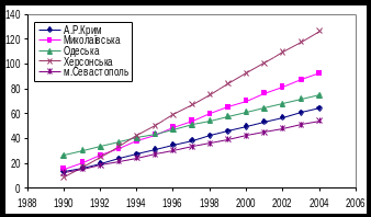 До південної України відносяться такі області: А.Р.Крим, Миколаївська, Одеська, Херсонська та м. Севастопль. Тенденції росту захворюваності в цих областях мають лінійну залежність